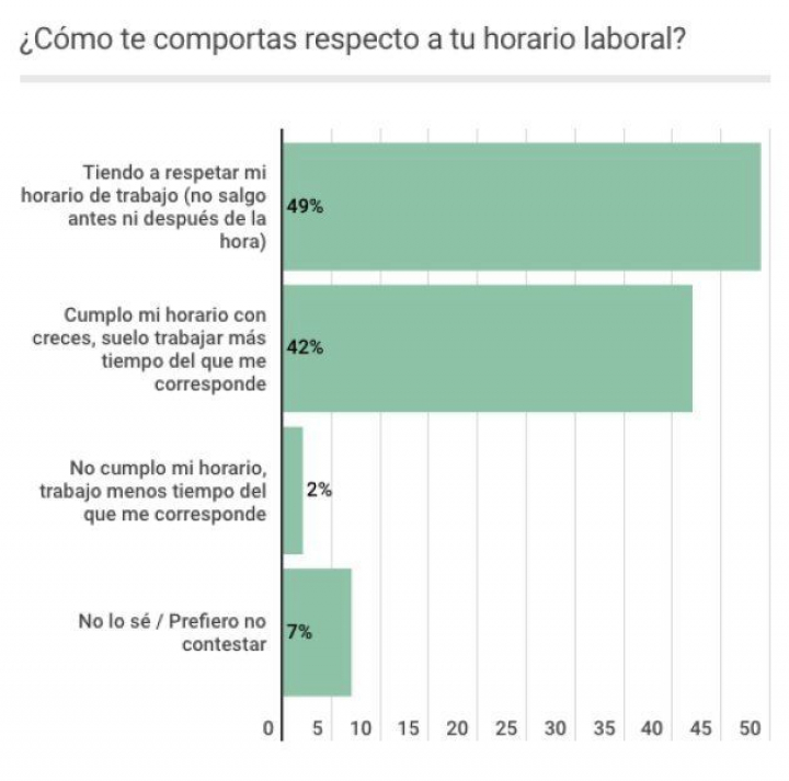 Aunque una mayoría (49%) dice cumplir estrictamente su horario de trabajo, es decir, que ni sale antes ni sale después de su hora; hay un significativo 42% de los encuestados que admite dedicarle más tiempo a su trabajo del que debiera. Sólo un 2% dice hacer menos horas.