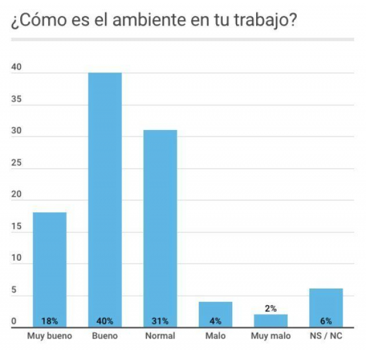 En general, los españoles consideran mayoritariamente (un 71%) que su ambiente de trabajo es entre bueno y normal. Sólo un 18% lo califica de muy bueno y un 6% entre malo y muy malo.