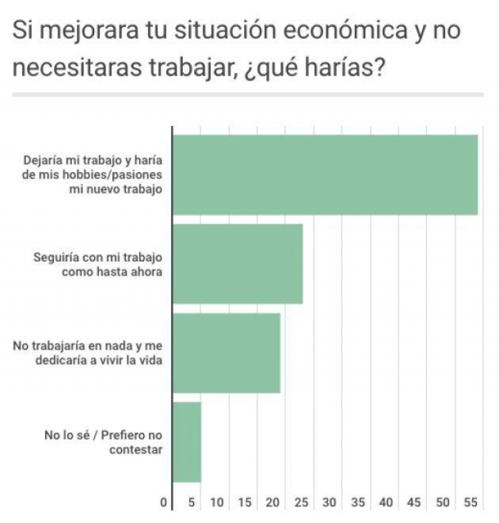 Un 54% dice que dejaría de trabajar y que convertiría sus aficiones en su nuevo trabajo, y un 19% afirma que no trabajaría en nada y que se dedicaría a vivir la vida.