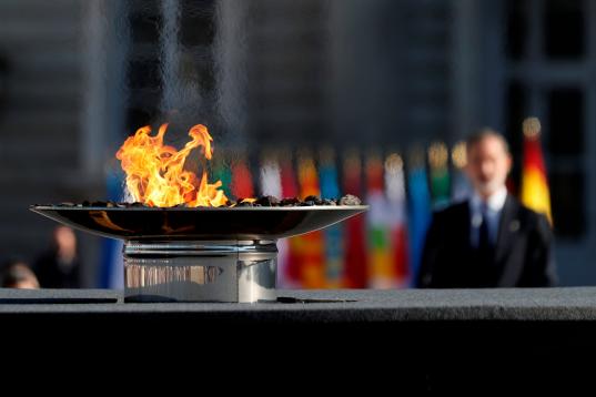 MADRID, 15/07/2021.- Los reyes Felipe y Letizia realizan una ofrenda floral ante el pebetero instalado en el Patio de la Armería del Palacio Real duranta el acto de homenaje de estado a las víctimas de la pandemia de la covid-19 y de reconocim...