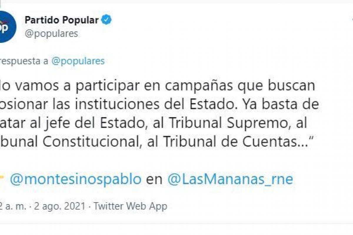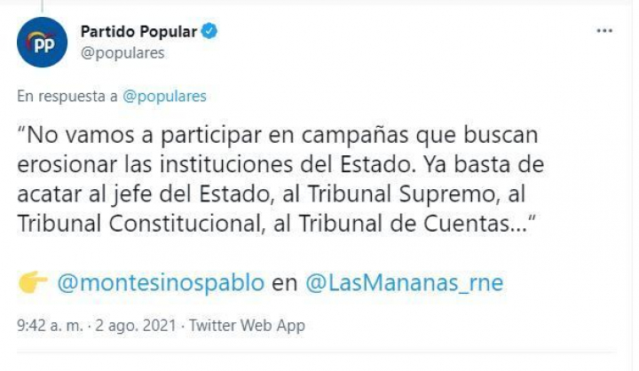 “No vamos a participar en campañas que buscan erosionar las instituciones del Estado. Ya basta de acatar al jefe del Estado, al Tribunal Supremo, al Tribunal Constitucional, al Tribunal de Cuentas...”, decía, textualmente, el tuit del PP, que ya ha sido borrado.