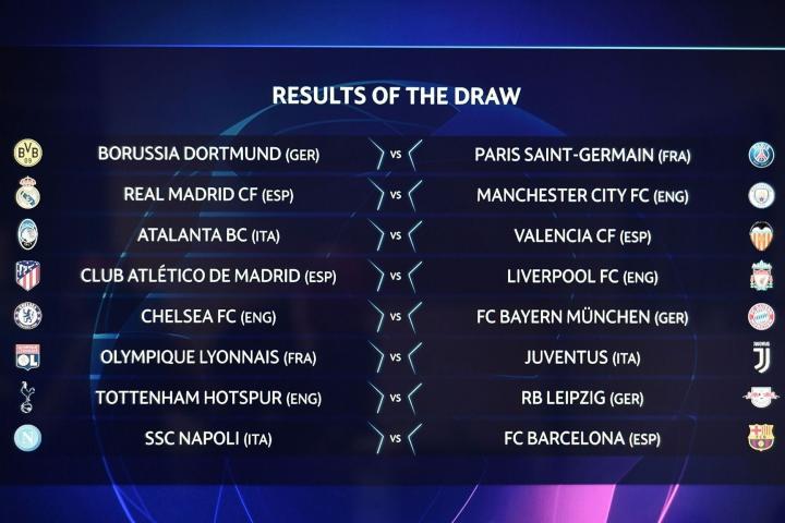 Además el alemán Borussia Dortmund se las verá con el PSG francés, el Chelsea jugará frente al Bayern Munich, la Juventus de Cristiano Ronaldo se medirá con el Lyon y el subcampeón Tottenham jugará con el Leipzig, líder de la Bundesliga.