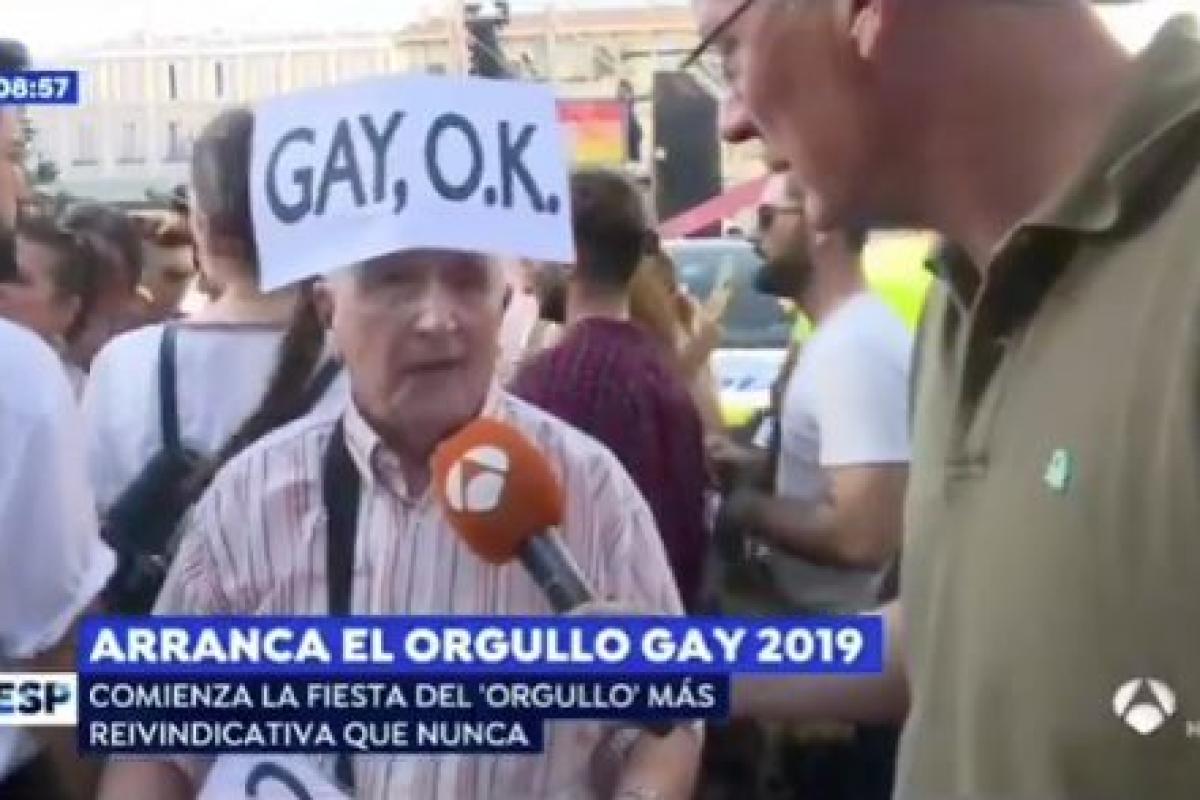 En un reportaje sobre el inicio de la celebración que tendrá lugar este fin de semana, el reportero del programa se topó con un señor mayor que llevaba en la cabeza un cartel en el que se podía leer “GAY, OK”.