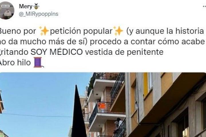 “Total que el señor ya estaba poniéndose blanco morado verde y de los colores de todas las procesiones de Linares y dije ya. Me acerqué a la capataz, le expliqué en 3 segundos y le di mi cirio. Me salí de la procesión con un soy médico (por fin). La gente flipando”, escribía María en su cuenta de Twitter.