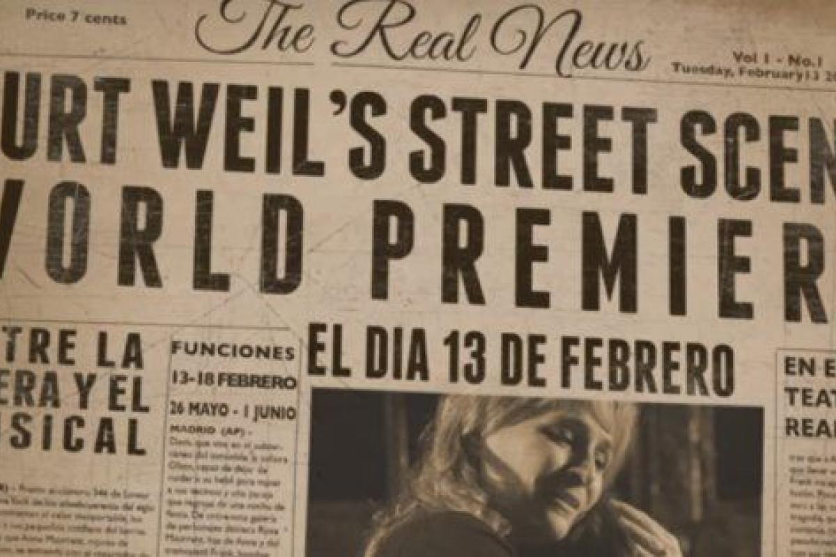 Street Scene, de Kurt Weill, está basada en un célebre texto teatral del gran dramaturgo americano Elmer Rice estrenado en 1929 y galardonado con el Premio Pulitzer. Rice se convirtió en el más implacable luchador contra el fanatismo racial y religioso de su época, y denunció sistemáticamente el fracaso de los esfuerzos reformistas del siglo XIX con imágenes literarias devastadoras sobre las condiciones en las que sobrevivían los inmigrantes y refugiados en el Nueva York de finales de los años veinte: hacinamiento en viviendas precariamente construidas, sin servicios públicos, y sin capacidad de reacción ante los incendios y la propagación de enfermedades.