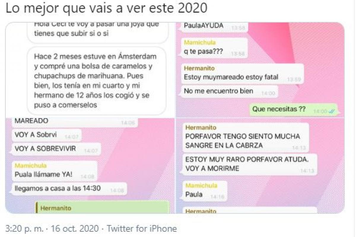 ″¿Qué necesitas?”, le dice ella a su hermano. ”¿Había algo en los caramelos que me has dado?”, pregunta él. “Qué coño haces, nunca te he dado de esa bolsa de caramelos. Madre mía voy corriendo a ayudarte ya”, responde ella en mayúsculas al darse cuenta que ha tomado los caramelos con marihuana.
