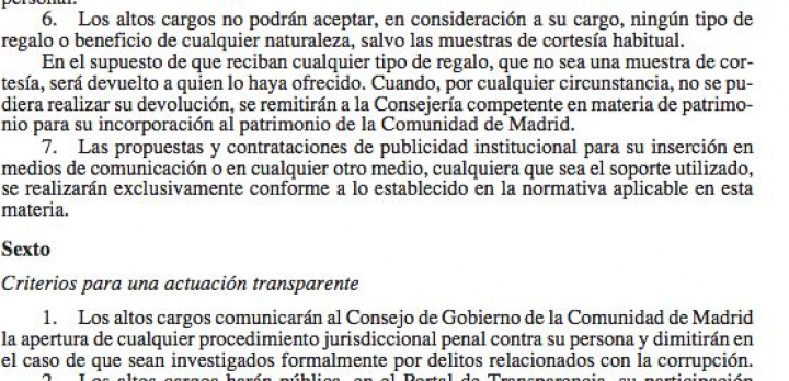 Según recoge el código ético de los altos cargos de la Comunidad de Madrid, éstos “no podrán aceptar, en consideración a su cargo, ningún tipo de regalo o beneficio de cualquier naturaleza, salvo las muestras de cortesía habitual”.