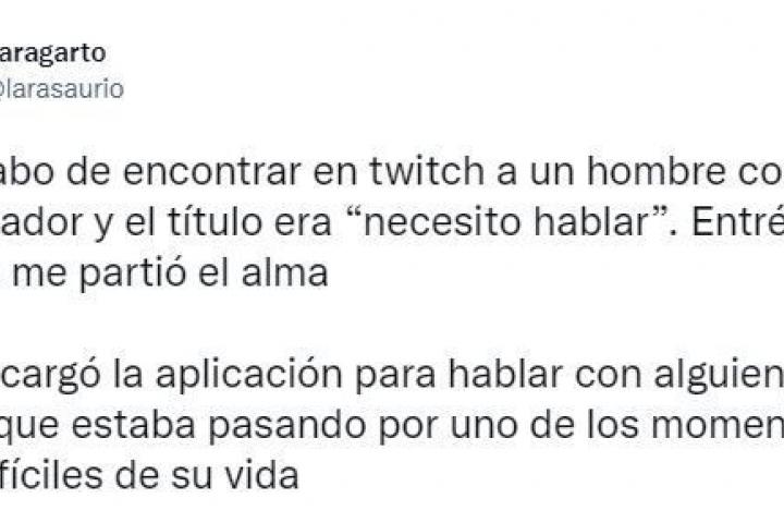 “Me acabo de encontrar en twitch a un hombre con 1 espectador y el título era “necesito hablar”. Entré y su mirada me partió el alma. Se descargó la aplicación para hablar con alguien, nos contó que estaba pasando por uno de los momentos más difíciles de su vida”, escribió esta usuaria de Twitter. Ese mensaje supera ya los 71.000 ‘me gusta’ y ha tenido muchos comentarios e interacciones.