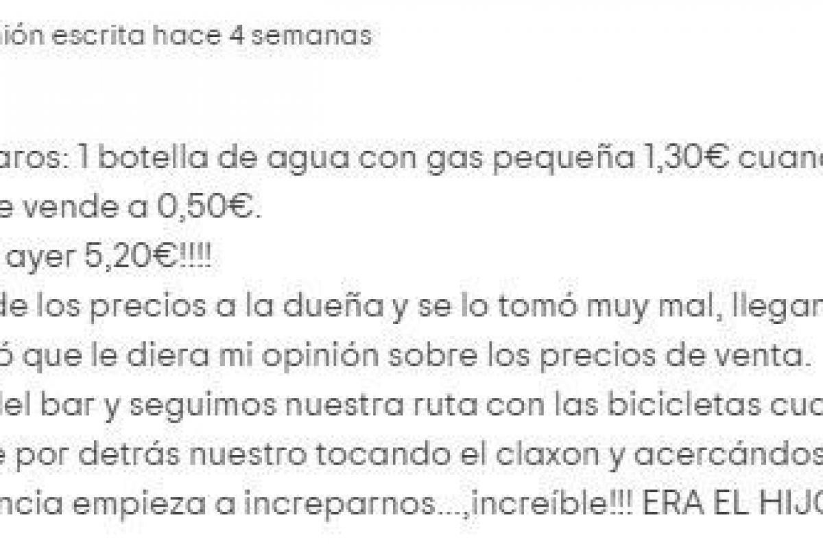 “Le comenté esto de los precios a la dueña y se lo tomó muy mal, llegando a dar gritos porque no le gustó que le diera mi opinión sobre los precios de venta. Nos marchamos del bar y seguimos nuestra ruta con las bicicletas cuando en medio del trayecto un coche por detrás nuestro tocando el claxon y acercándose a nosotros sin mantener la distancia empieza a increparnos...,increíble!!! ERA EL HIJO DE LA DUEÑA DEL BAR!!!”, escribe el cliente.