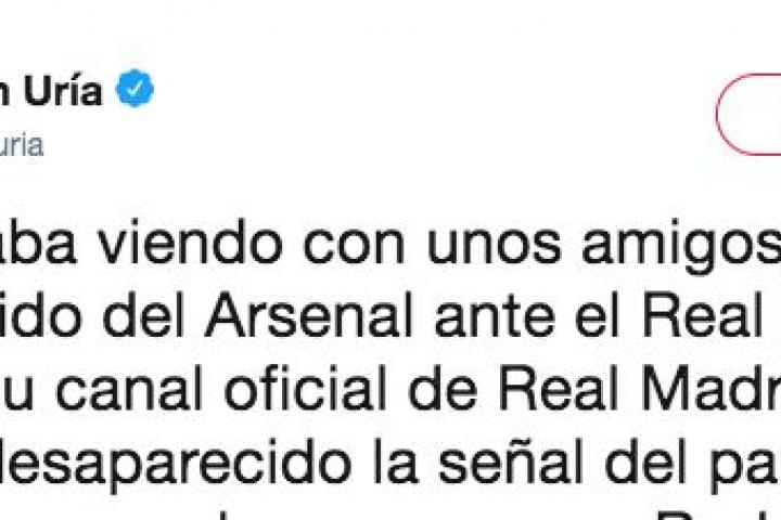 “Estaba viendo con unos amigos el partido del Arsenal ante el Real Madrid en su canal oficial de Real Madrid TV Y ha desaparecido la señal del partido para, en su lugar, aparecer Rodrigo Rato en 1996...surrealista. ¿A alguien más le ha pasado?”, ha comentado en Twitter el periodista.