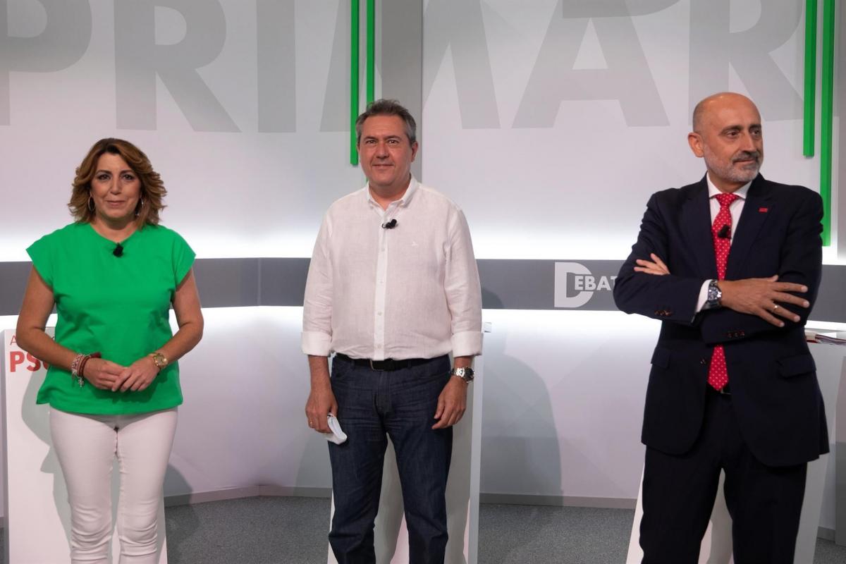 Susana Díaz, Juan Espadas y Luis Ángel Hierro han participado, desde las 20,00 horas de este martes, en la sede regional del partido, en la calle San Vicente de Sevilla, en un debate a tres, el único contemplado por ahora durante la campaña informativa puesta en marcha durante este proceso, que tiene en el próximo domingo, 13 de junio, su jornada de votación.