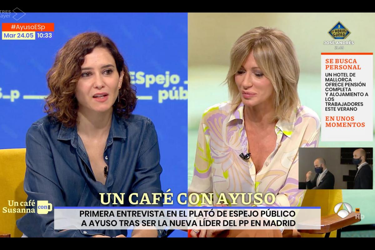 Susanna Griso ha entrevistado este martes a Isabel Díaz Ayuso, que estado de ruta por las instalaciones de Atresmedia: primero con Carlos Alsina en Onda Cero y después en Espejo Público.