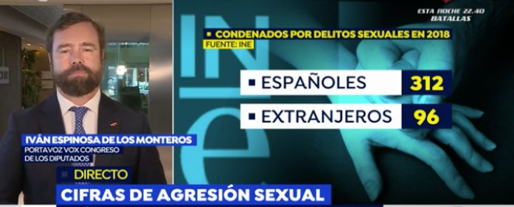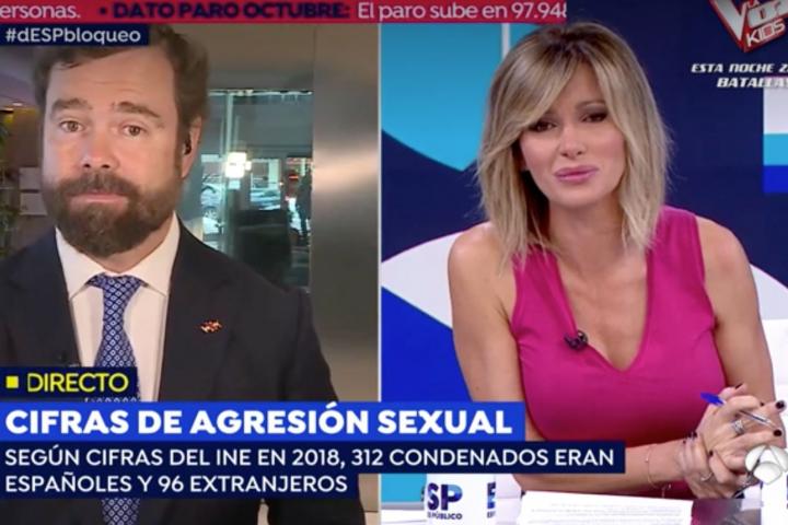Ante eso, el líder del Vox aseguró que esa cifra hay que cogerla en otro contexto porque los españoles son 10 veces más numerosos que los extranjeros. “Un extranjero es tres veces más propenso a violar según las estadísticas que me acaba de dar usted”, zanjó.