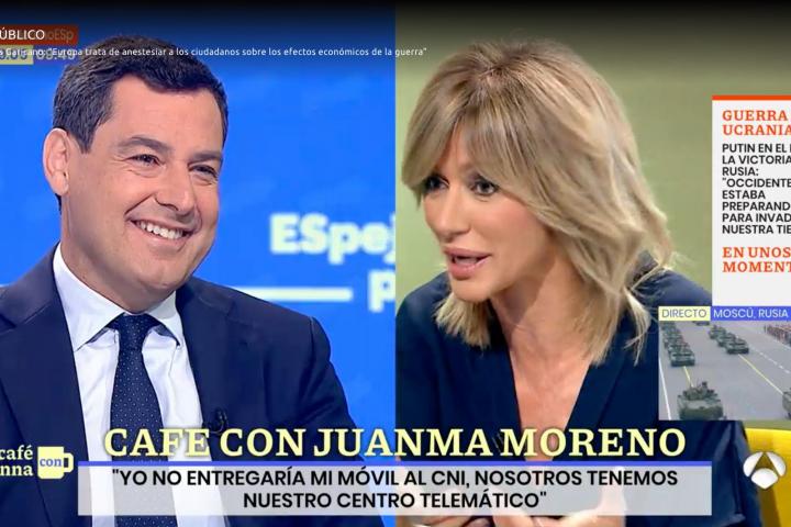 La periodista Susanna Griso ha protagonizado este lunes un llamativo momento durante su entrevista en Espejo Público a Juanma Moreno, presidente de la Junta de Andalucía, que ha empezado diciendo que él no entregaría su teléfono móvil para que se compruebe si le han espiado y, ante las cuestiones de la presentadora, ha acabado diciendo que sí lo haría.