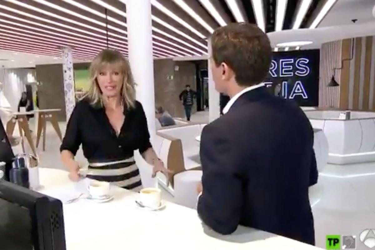 La periodista entrevistaba este miércoles al líder de Ciudadanos, Albert Rivera, pero lo que nadie esperaba es que la primera imagen de Espejo Público fuera la de ambos tomando un café tranquilamente en la cafetería de Atresmedia.