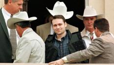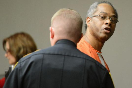 En imagen del 15 de noviembre de 2012, Carl Henry Blue observa a familiares y amigos mientras era escoltado de regreso a su celda después de que se fijó la fecha para su ejecución en la corte del condado de Brazos, en Bryan, Texas. Blue, de 4...