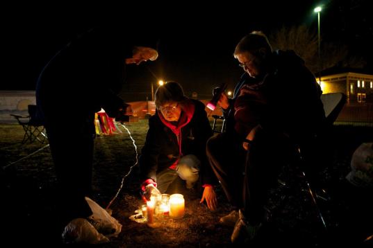Leona Wieland, de 65 años, al centro, enciende velas y veladoras con la hermana Janice Klein, a la izquierda, afuera de una penitenciaria en Sioux Falls, Dakota del Sur, en protesta por la ejecución en el lugar de Donald Moeller, acusado de la...