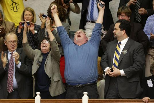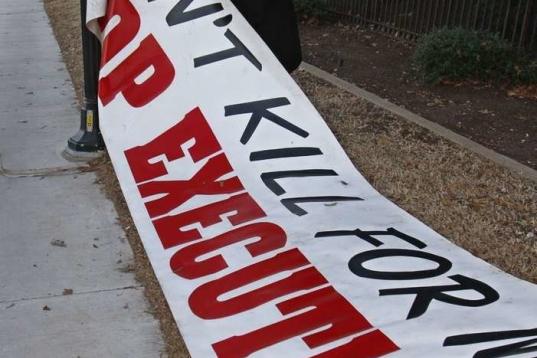 El abogado James T. Rowan despliega una manta contra la pena de muerte, afuera de la mansión del gobernador en Oklahoma City, Oklahoma, el jueves 6 de enero del 2011. Billy Don Alverson, de 39 años, fue ejecutado el jueves por el asesinato del...