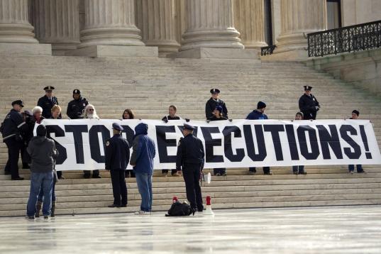 Manifestantes sostienen una manta en la escalinata de la Corte Suprema de la nación (que dice "detengan las ejecuciones), en Washington, el martes 17 de enero del , durante una protesta contra la pena de muerte. (Foto AP/Evan Vucci)