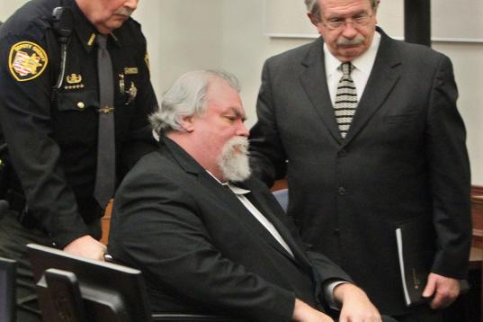 El abogado defensor Lawrence J. Whitney, derecha, acompaña a su cliente Richard Beasley, centro, después de que el jurado recomendó la pena de muerte en una corte de Akron, Ohio, el miércoles 20 de marzo de 2013. Beasley, un autoproclamado p...