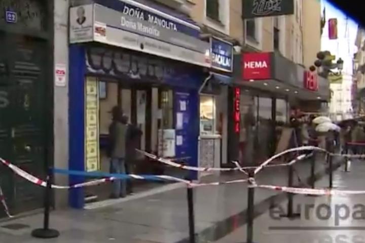 Menudo susto se han llevado quienes estaban haciendo cola este sábado en la popular administración de Lotería de Doña Manolita, en el centro de Madrid, cuando se ha desprendido una cornisa por el fuerte viento que azota la capital.
