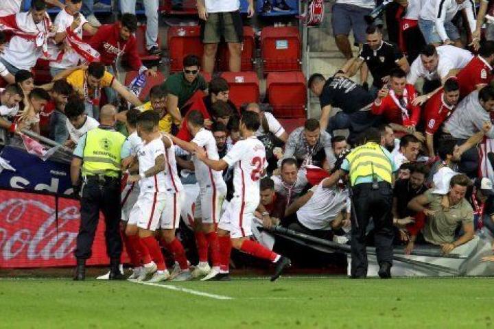 El suceso se produjo en el minuto 59 cuando, tras anotar el argentino Éver Banega un gol de penalti, se dirigió junto a sus compañeros a celebrar el tanto con su afición, sin rebasar los límites del campo, momento en el que una de las vallas cedió al abalanzarse el grupo de seguidores y varios espectadores, aficionados sevillistas, cayeron al campo.