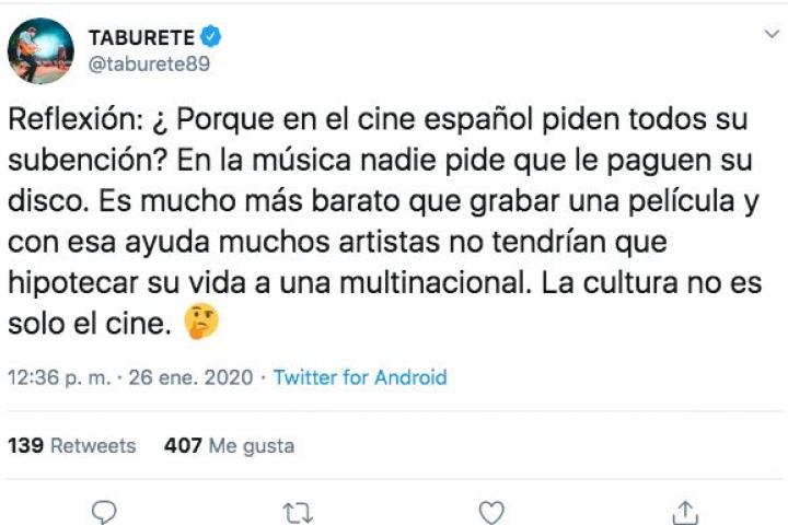 “Reflexión: ¿ Porque en el cine español piden todos su subención (sic)? En la música nadie pide que le paguen su disco. Es mucho más barato que grabar una película y con esa ayuda muchos artistas no tendrían que hipotecar su vida a una multinacional. La cultura no es solo el cine. 🤔”.