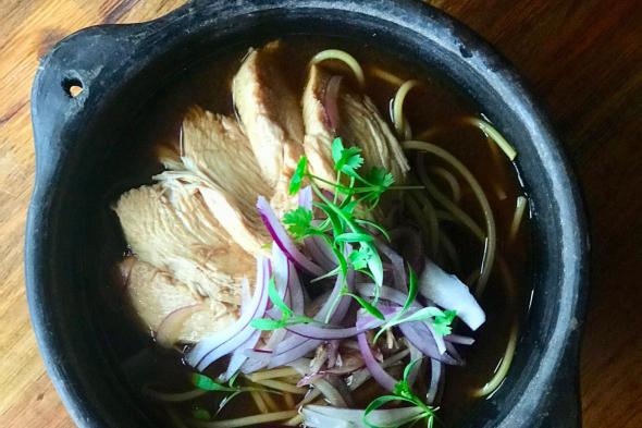 Colocar los fideos de arroz en un tazón, cubrir con el pollo cocido laminado y luego el caldo hirviendo. Cubrir con cilantro, albahaca, pepino chino, cebolla y brotes de soja... ¡Y a disfrutar!
