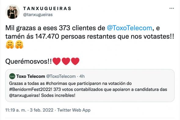 “Mil grazas a eses 373 clientes de @ToxoTelecom, e tamén ás 147.470 persoas restantes que nos votastes!! Querémosvos!!”, se puede leer en Twitter. Un mensaje que tiene más de 5.000 ‘me gusta’ y miles de retuits.