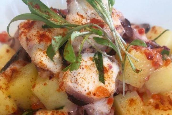 La ensalada de polvo es una especie de pulpo a la gallega deconstruido al que le sobra patata. El sabor es bueno y el pulpomás, lo que hace sentir demasiado la ausencia de este.