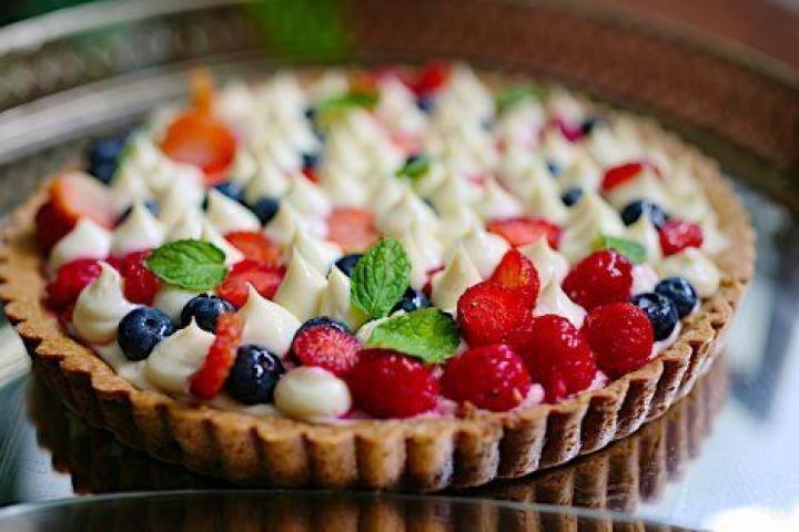 Tarta de chocolate blanco, yogur, frutos secos y frambuesas