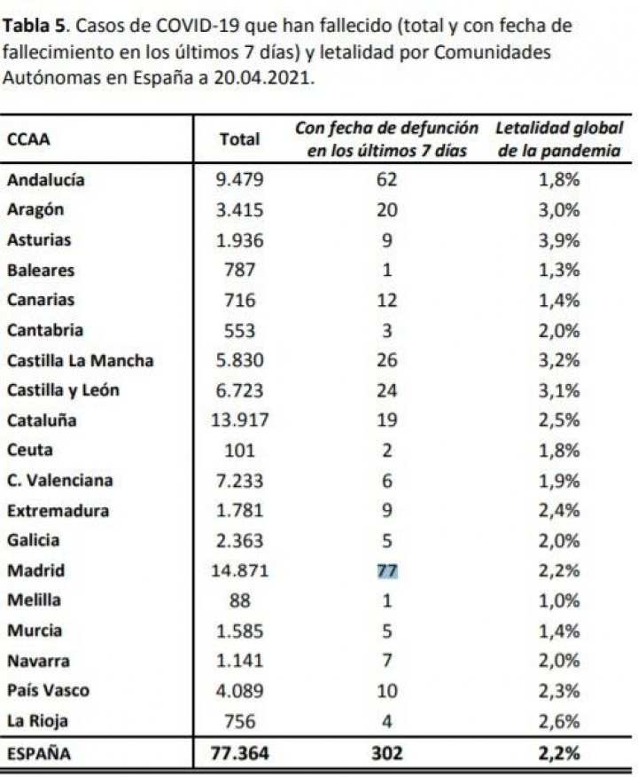 Según los registros del ministerio, la media española es de un 2,2%, con los datos hasta el martes. De los casi 3,5 millones de positivos confirmados más de 77.000 personas han perdido la vida, pero las diferencias entre territorios también son notorias en cuestiones de mortalidad.
