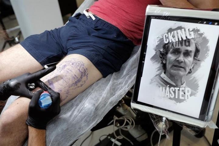 Mientras el artista Nacho Frías, del estudio internacional Noble Art, reproduce en su muslo izquierdo la cara de Simón con la frase “fucking master” (jodido maestro) sobre ella y con la técnica realismo en grises, explica a EFE que la idea surgió mientras le estaba tatuando otra imagen en estos días del estado de alarma.