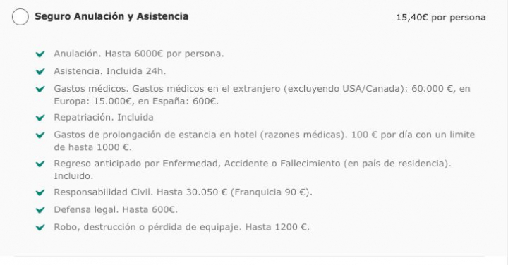 Si se intenta comprar un billete de avión de Madrid a A Coruña para una estancia de siete días con Iberia, la aerolínea ofrece un seguro de asistencia en viajes de 15,40 euros por persona con la aseguradora Allianz.