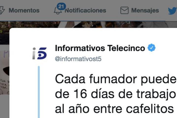 La cuenta oficial de Informativos Telecinco en Twitter ha tenido que matizar un mensaje informando sobre la ley de horarios en el que se aseguraba que cada trabajador pierde de media 16 días de trabajo fumando y 11 días y medio “entre cafelitos y desayunos”.