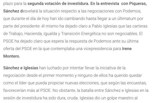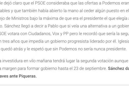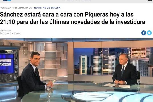 En su explicación a la audiencia, Pedro Piqueras apuntó que la entrevista se produciría el jueves, a partir de las 21 horas. Será, si finalmente se concreta, después de que Sánchez se someta a una votación de investidura a la que llega tras frenéticas y problemáticas negociaciones con Podemos.
