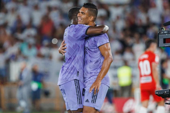 David Alaba y Carlos Casemiro se abrazan al acabar el partido contra la UD. Almería.NurPhoto via Getty Images