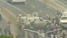 En los alrededores de la base aérea militar La Carlota, manifestantes encapuchados se han enfrentado durante más de tres horas con agentes de la fuerza pública que han hecho uso de sus armas en numerosas ocasiones. La Guardia Nacional Bolivariana (GNB, policía militarizada) ha desplegado varias tanquetas en la zona para apoyar su acción disuasiva.