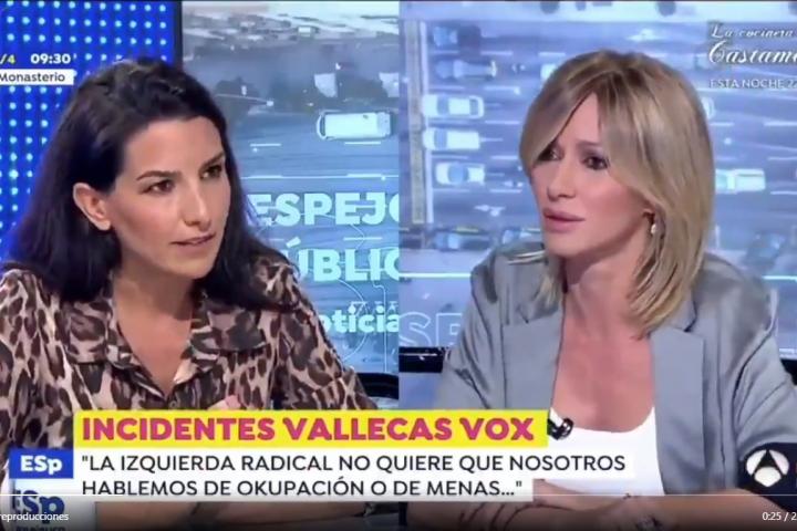 La presentadora de Espejo Público, Susanna Griso, y la candidata de Vox a las próximas elecciones de la Comunidad de Madrid, Rocío Monasterio, han mantenido una fuerte discusión durante la entrevista realizada en el programa de Antena 3.