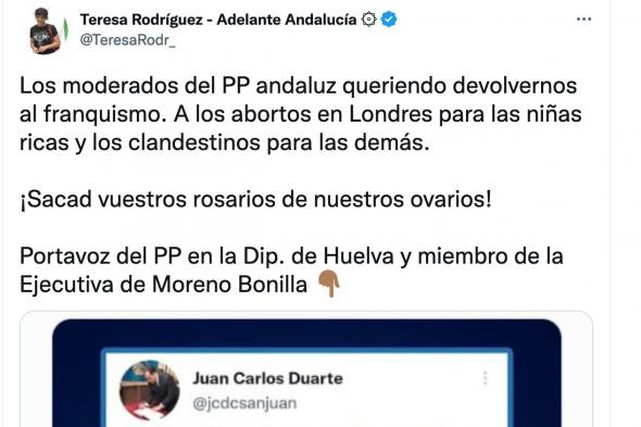 Rodríguez ha compartido una captura de pantalla con estos dos tuits y ha comentado que “los moderados del PP andaluz queriendo devolvernos al franquismo”.