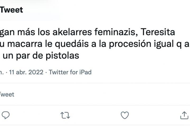 Tras compartir estos dos mensajes, un usuario le ha dicho: “Te pegan más los akelarres feminazis, Teresita Tu y tu macarra le quedáis a la procesión igual q a un cristo un par de pistolas”.