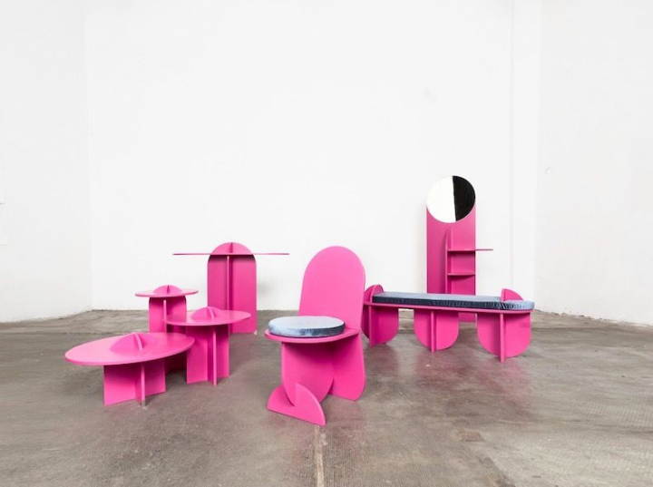 Próximamente presentaremos una nueva colección que se inspira en la sinuosidad de las hojas de acero y guiña el brillo de las bolas de espejos. Constará de cuatro productos: un salón de silla, un banco, una mesa de café y un puf.