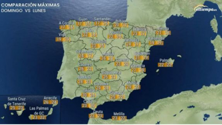 Madrid, por ejemplo, pasará de los 26 a los 18 grados, una caída parecida a las de Salamanca, Zaragoza o Valladolid.