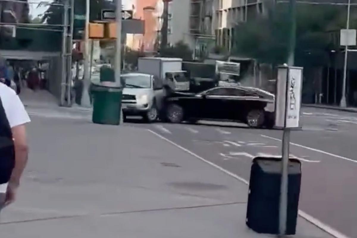 En el video, que fue grabado por un viandante el sábado, se ve como un Mercedes persigue a un Toyota hasta robar una mochila negra, en la que, según dijo la Policía al New York Post, había 20.000 dólares.
