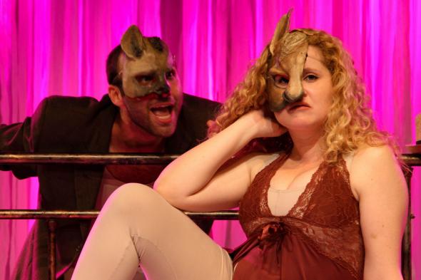 Por tanto, se trata de una obra que se mueve entre el culebrón y el drama clásico. Y, que una vez vista, también tiene su parte de comedia. Aspecto que el montaje de Teatro Condensao deja entrever en algunos momentos con los que hace reír el espectador y que de haber incidido más hubiera beneficiado el montaje. Este punto cómico, tal vez se deba al acierto de trabajar los personajes a partir de su animalidad, sobre la que han construido la humanidad de los mismos. Aspecto que se marca con una máscara de animal (o parecido) que solo les cubre media cara. Un interesante contraste entre la animalidad fija de la que no nos podemos desprender, nuestro arquicerebro, esa semi máscara, y la humanidad que podemos construir que se refleja en los gestos de la parte de la cara sin descubrir.