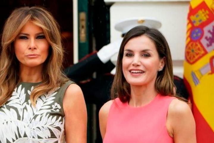 Frente a los enchaquetados masculinos, Letizia y Melania han acaparado de nuevo las miradas por la elección de sus vestidos para este día. La española escogía para la ocasión un vestido de tubo en color rosa con cuello redondo, cinturón a juego en el que destacan los botones. La norteamericana, por su parte, optaba por un diseño midi con amplio estampado floral en color blanco y volumen en la falda.