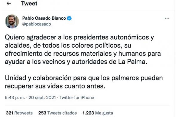 “Quiero agradecer a los presidentes autonómicos y alcaldes, de todos los colores políticos, su ofrecimiento de recursos materiales y humanos para ayudar a los vecinos y autoridades de La Palma”, ha escrito Casado antes de rematar: “Unidad y colaboración para que los palmeros puedan recuperar sus vidas cuanto antes”.