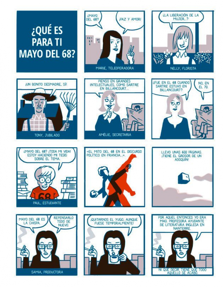 Y aquí están estos "Mayo del 68" tan diversos, de dominio público, tomando una nueva forma. Nos convertimos en testigos de una suerte de "reencarnación" en viñetas, que se presta a que se haga con toda la desenvoltura necesaria.