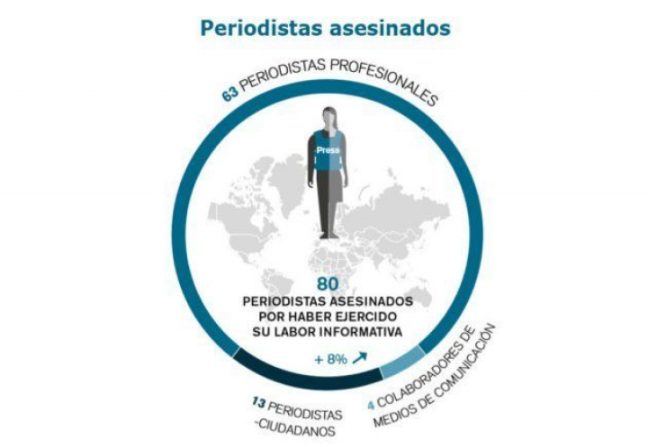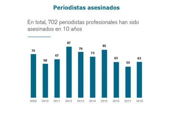 Este aumento tan "preocupante" se ve ya, directamente, en el dato más crudo: el de las muertes. Este año se ha cosechado un 8% más de asesinatos, con 63 periodistas profesionales, 13 periodistas ciudadanos y cuatro colaboradores de medios de comunicación. El 61% de ellos fueron atacados de forma deliberada y otro 39% fue asesinado o agredido cuando ejercía su labor. El 96%, además, son varones. En la última década, 702 informadores profesionales han perdido la vida.