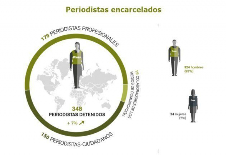 En el caso de los encarcelados, este año se han registrado 348, frente a os 326 del año previo. Es un 7% más. De ellos, 179 son informadores profesionales, 150 periodistas ciudadanos y 19 colaboradores. El 93%, hombres. Cinco países siguen acaparando más de la mitad de los casos: se trata de Irán (28), Arabia Saudí (28), Egipto (38), Turquía (33) y China (60 presos, la mayor cárcel para un reportero).